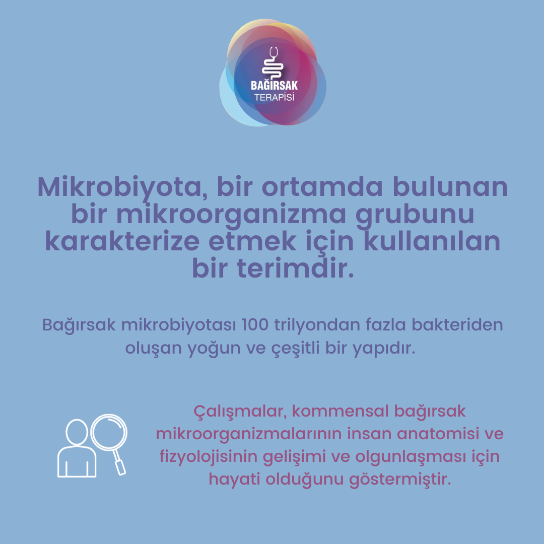 Bu mikroorganizmaların çoğu faydalı (dost) bakteri türleri olmakla birlikte mantar, maya ve küf türü mikroorganizmalar da bulunmaktadır. Tüm bu mikroorganizmalar bağırsaklarımızda binlerce alt türüyle birlikte bir karışım ve topluluk halinde bulunurlar. Bağırsaklarımızdaki bu mikroorganizma topluluğuna mikrobiyota veya bağırsak florası denir. Her kişinin bağırsaklarındaki mikroorganizma çeşidi ve dağılımı farklı olduğu için herkesin kendine özgü bir bağırsak florası (mikrobiyotası) mevcuttur.