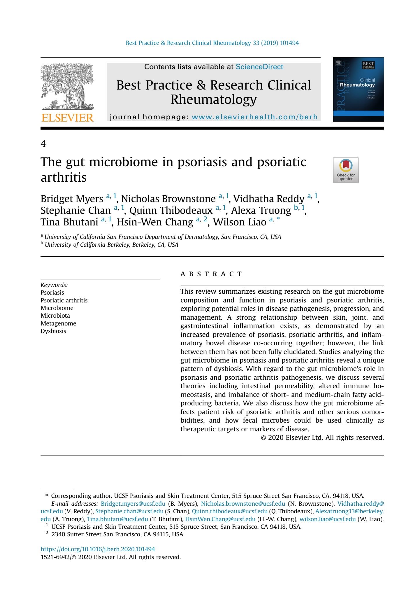 Bu derleme, sedef hastalığı ve psoriatik artritte bağırsak mikrobiyomu bileşimi ve işlevi üzerine mevcut araştırmaları özetlemekte, hastalık patogenezi, ilerlemesi ve yönetimindeki potansiyel rolleri araştırmaktadır. Sedef hastalığı, psoriatik artrit ve birlikte ortaya çıkan inflamatuar bağırsak hastalığının artan prevalansının gösterdiği gibi, deri, eklem ve gastrointestinal inflamasyon arasında güçlü bir ilişki mevcuttur; ancak aralarındaki bağlantı tam olarak aydınlatılamamıştır. Sedef hastalığı ve psoriatik artritte bağırsak mikrobiyomunu analiz eden çalışmalar, benzersiz bir disbiyoz paternini ortaya koymaktadır. Bağırsak mikrobiyomunun sedef hastalığı ve psoriatik artrit patogenezindeki rolüyle ilgili olarak, bağırsak geçirgenliği, değişmiş bağışıklık dengesi ve kısa ve orta zincirli yağ asidi üreten bakterilerin dengesizliği gibi çeşitli teorileri bu yayında tartışılmıştır. Ayrıca bağırsak mikrobiyomunun hastanın psoriatik artrit ve diğer ciddi komorbidite riskini nasıl etkilediğini ve dışkı mikroplarının klinik olarak terapötik hedefler veya hastalık belirteçleri olarak nasıl kullanılabileceğini bu yayında tartışılmıştır.